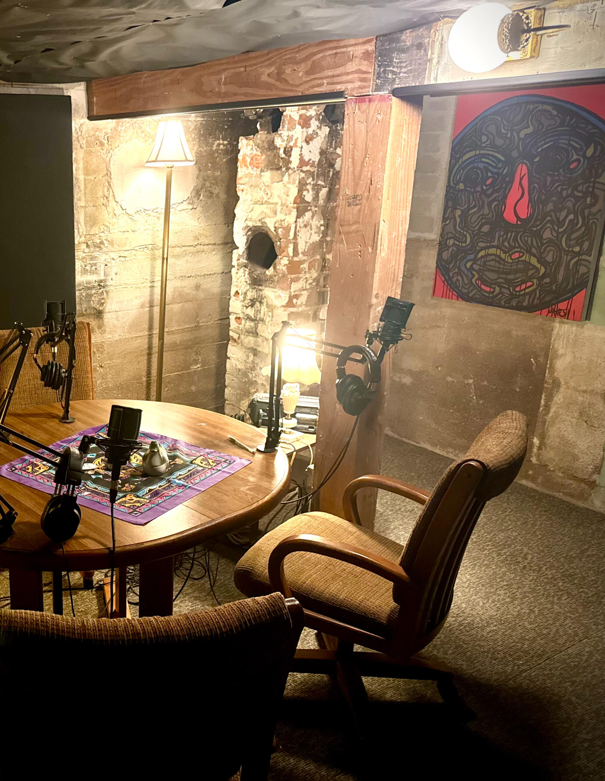 Our state of the art podcast studio produces beautiful sound is nestled down in the boiler room and features eclectic art and vintage furnishings.